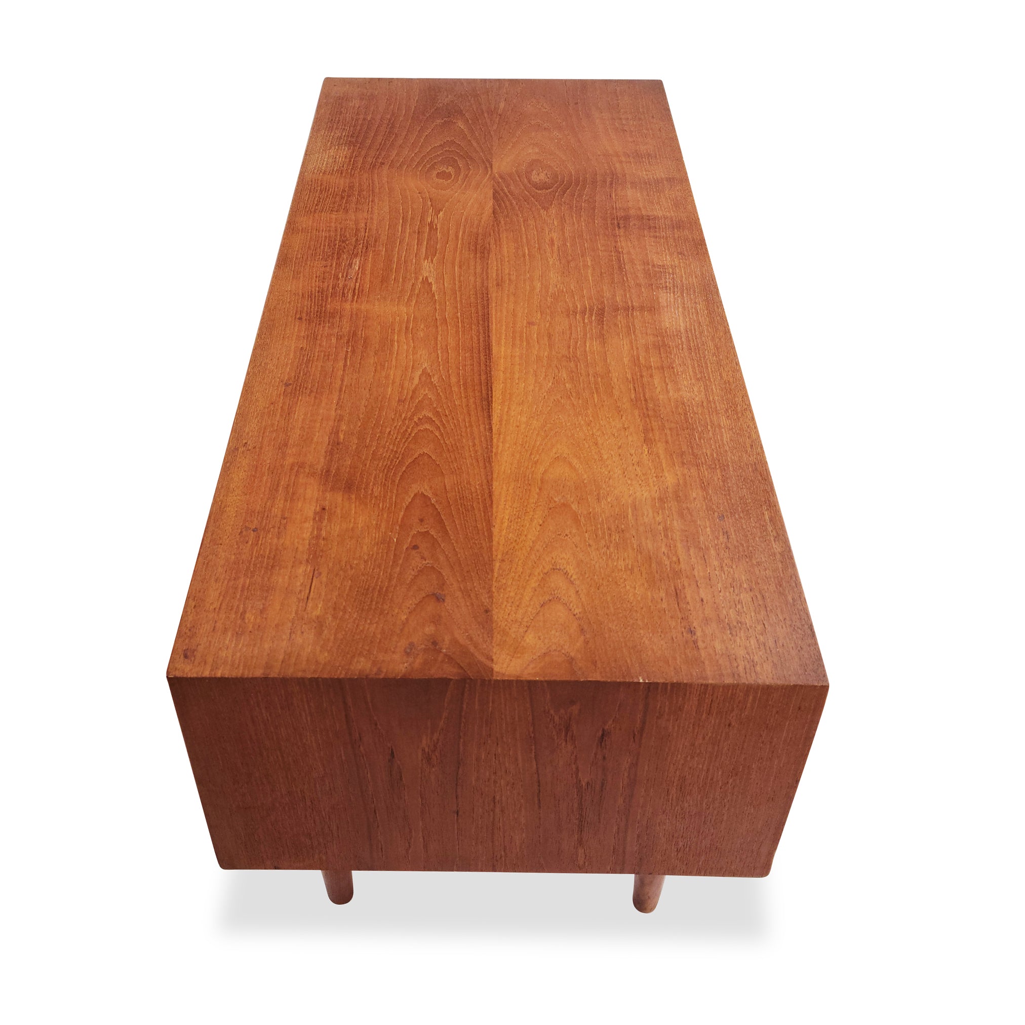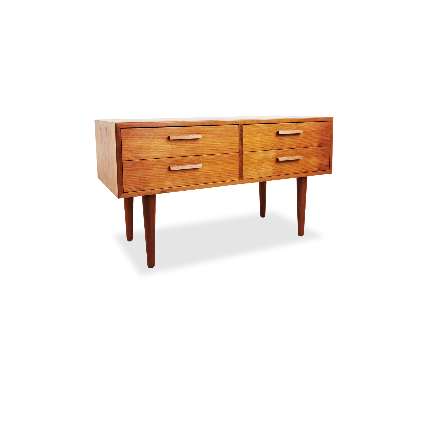 Description: Mid century four drawer console by Danish Designer Kai Kristiansen. Long tapered legs and modern drawer pulls. Dovetail joinery on the drawers.