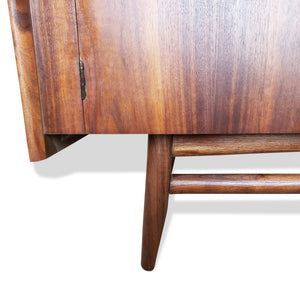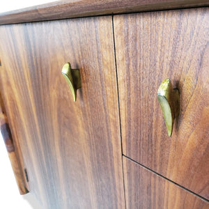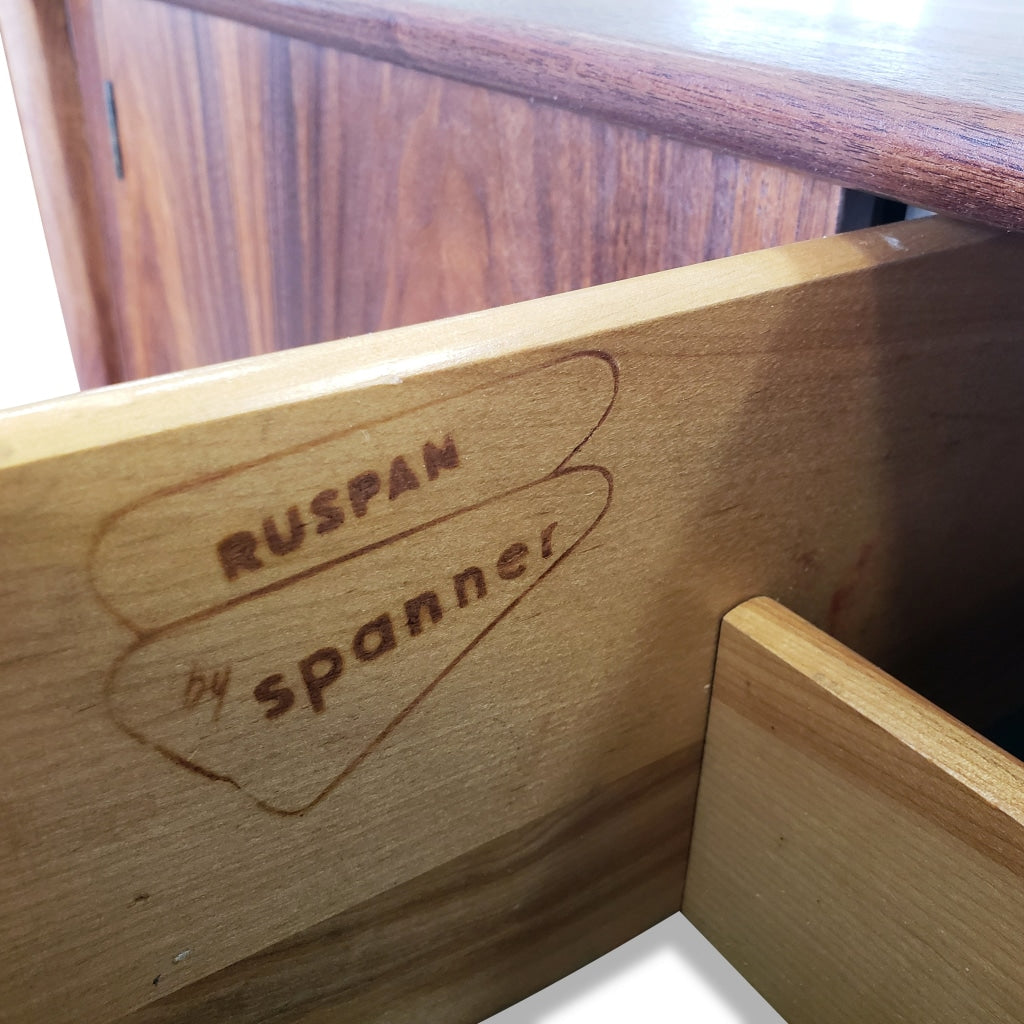 Description: Vintage walnut sideboard designed by Russell Spanner circa 1960s. Beautiful solid walnut curved legs. Extra deep for added storage. Original brass drawer pulls contrast the walnut wood grain perfectly.