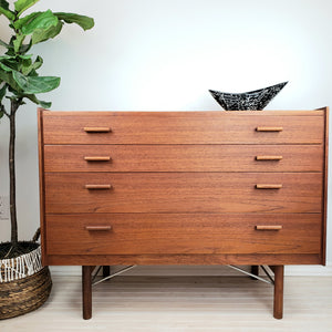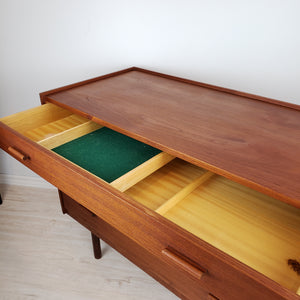 Description:Two Available. Stunning mid century chest of drawers by Danish designer Ib Kofod-Larsen. Features his recognizable drawer pulls, tapered legs, and support system. Top drawer has a sliding felt lined tray. Furniture designer Ib Kofod-Larsen's furniture from the 1950's and 60's are more desirable today, than ever before. This is a rare example of Mid Century Scandinavian Design.