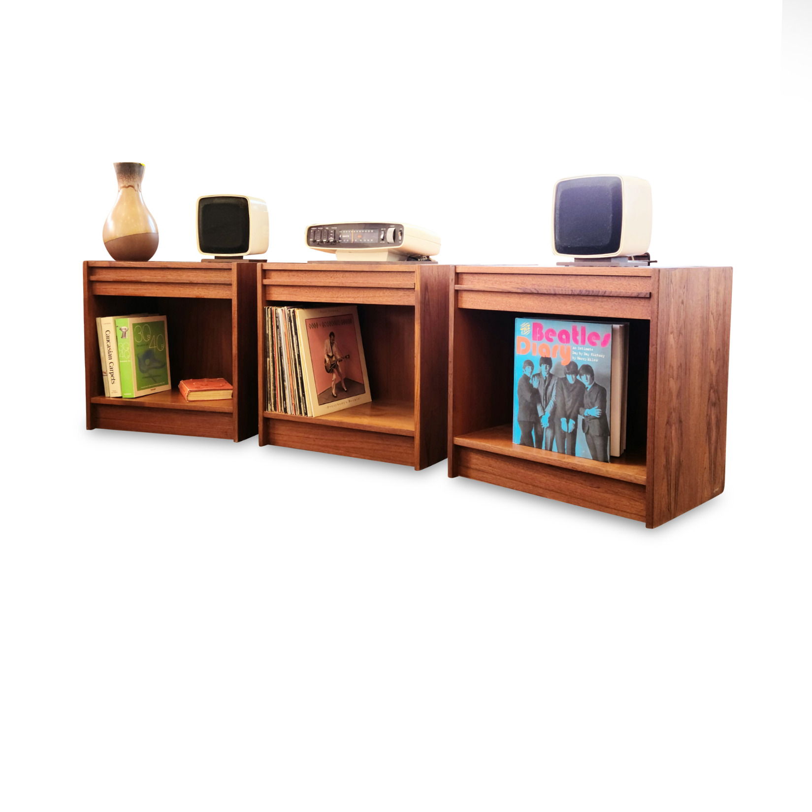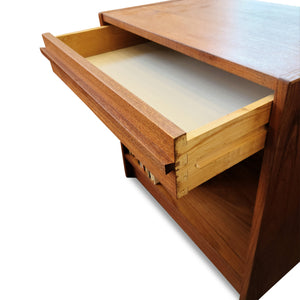 Description: Vintage teak compact side table/nightstand/record cabinet. Three Available.
