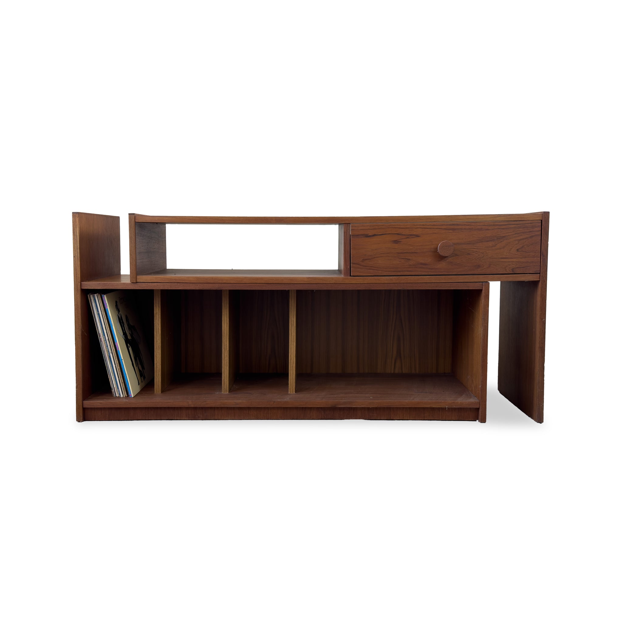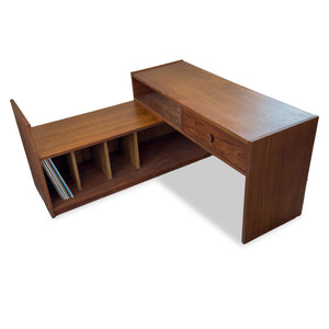 Description: Teak record cabinet. Two-piece "L" shaped design. You can  extend the length of the unit by cantilevering one unit over the other.