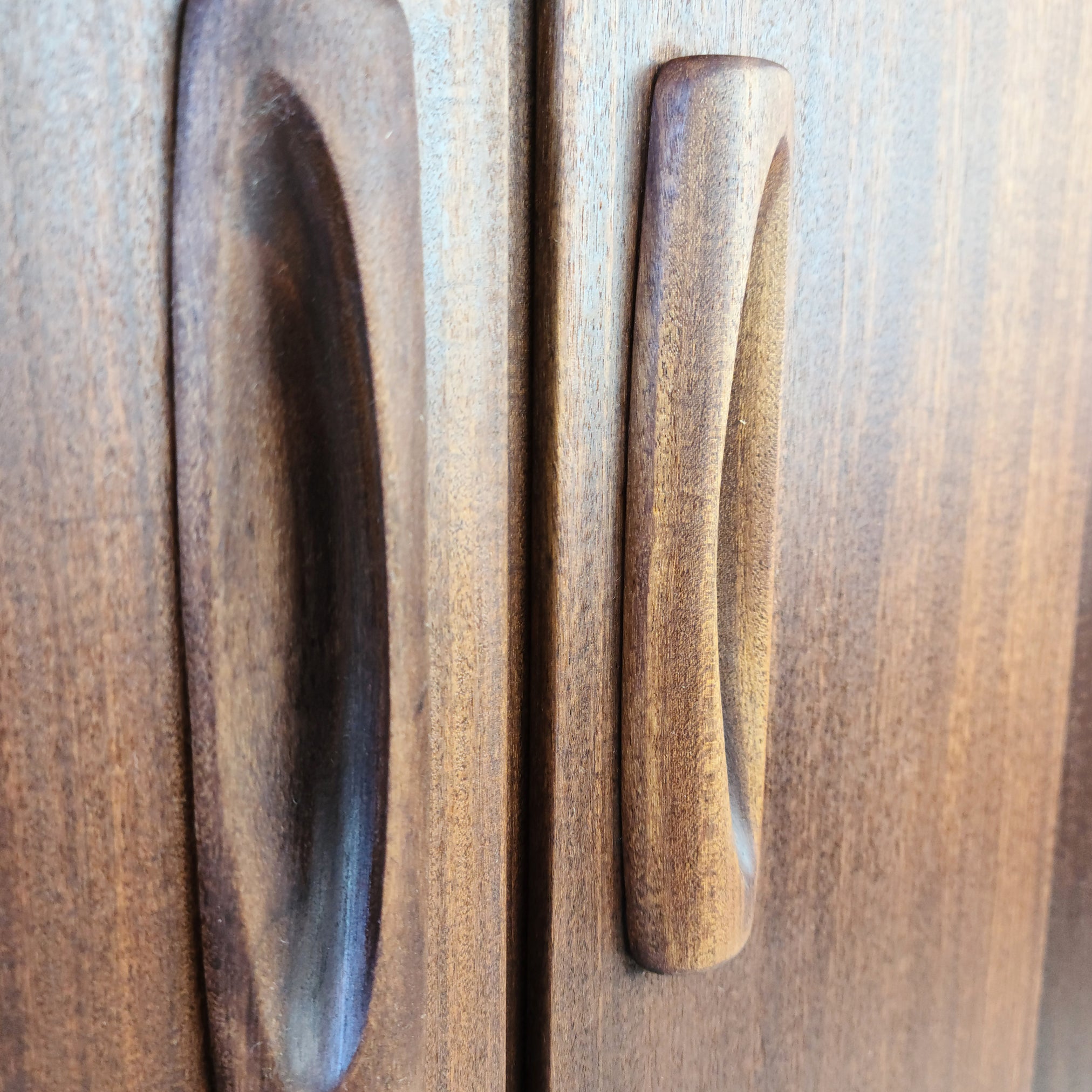 Description: Afromosia four door sideboard by Jan Kuypers for Imperial. Four cupboard doors side-by-each. Fully built of solid African Teak. Sculpted crescent pulls. Splayed squared legs.