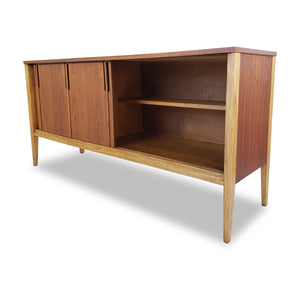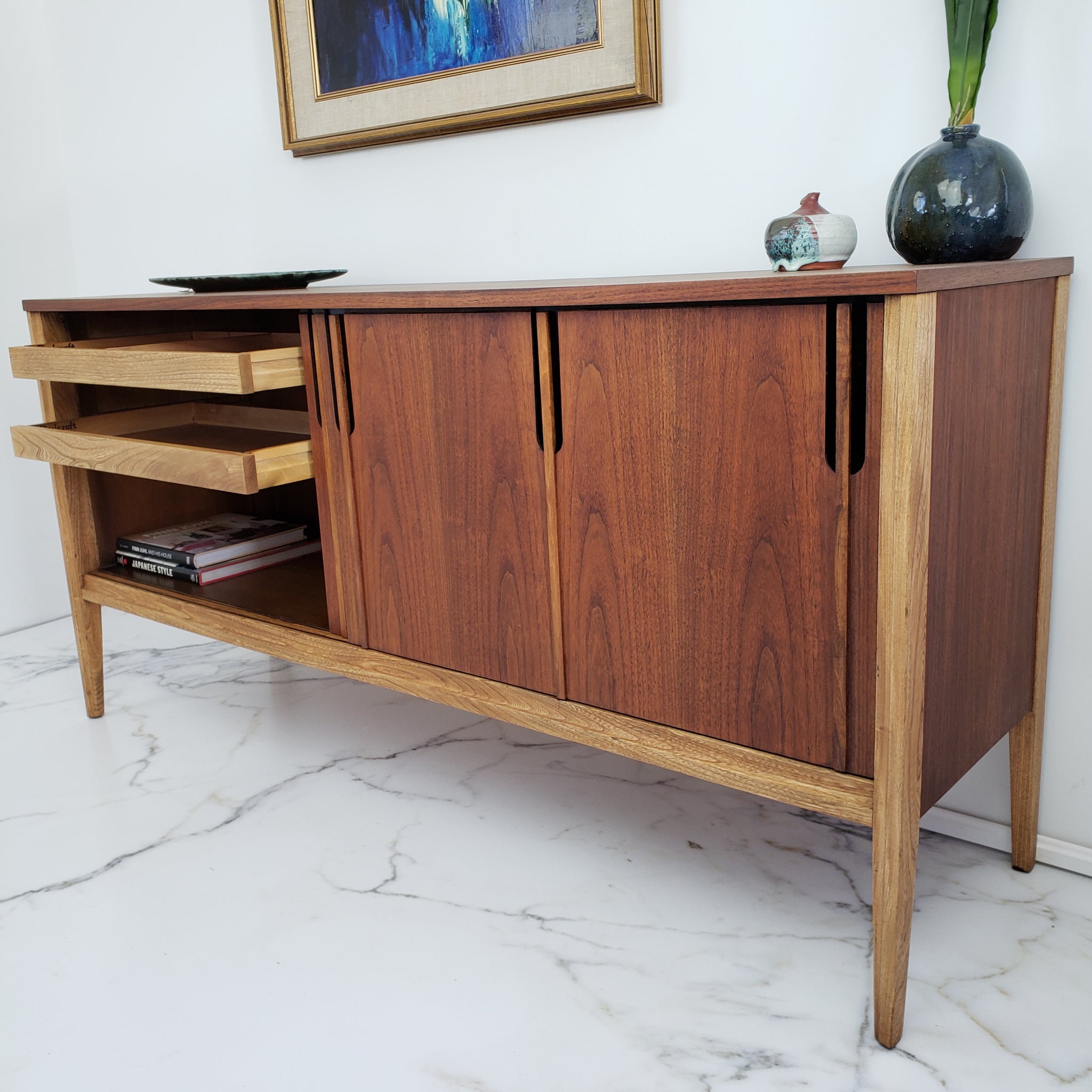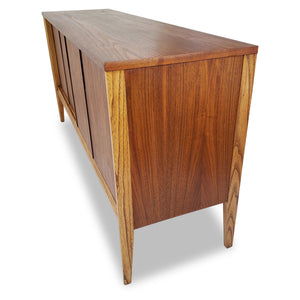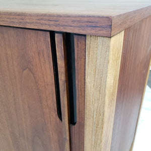 Description: Vintage Walnut and Ash sideboard by Deilcraft Furniture of Kitchener, ON Circa 1968. Two sliding doors with cutout ebony toned pulls. Two shallow drawer pulls out from the left side.