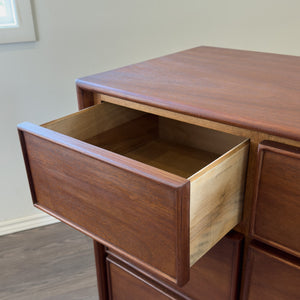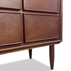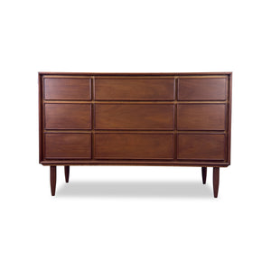 Description: Vintage nine drawer dresser. Mahogany with teak tone.