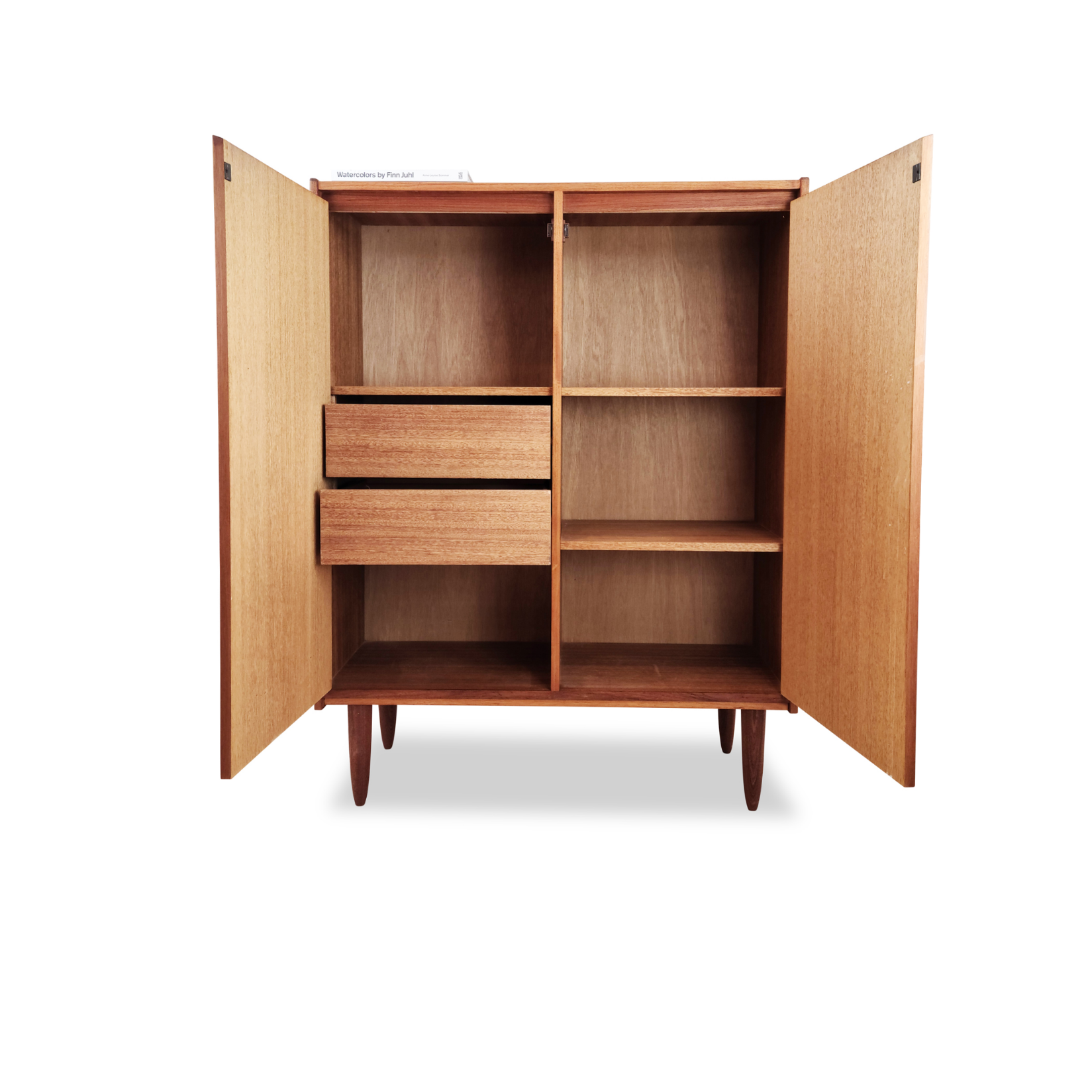 Description: Teak upright dresser with double hinged doors. Interior has adjustable shelving and two drawers.