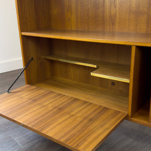 Description: Vintage walnut liquor cabinet/bookcase/record cabinet by Clausen and Son. Drop down bar with signature bowtie pull. Hairpin Legs