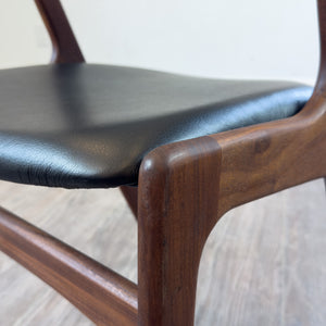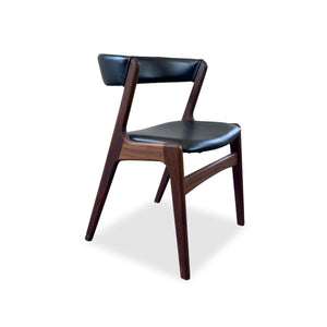 Description: Single Model T21 dining chair by Korup Stolefabrik. One of the most striking profiles of any mid century chair we have seen. Genuine black leather.