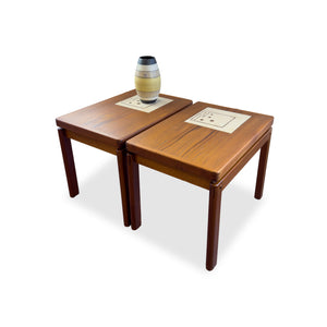 Description: Pair of teak side tables. Detailed finger joinery and earth tone tile inlay. Perfect spot to place to your coffee mug.