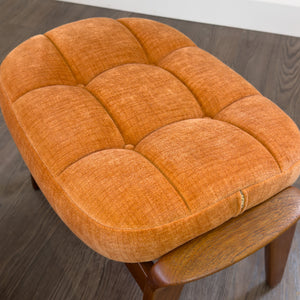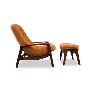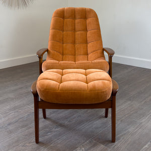 Description: An elusive R. Huber Scoop Chair and ottoman. Amazing "scooped" seat that you just melt into. Beautiful restored solid teak frame and brand new Knoll Textiles "Papaya" Topos upholstery. New high density foam.