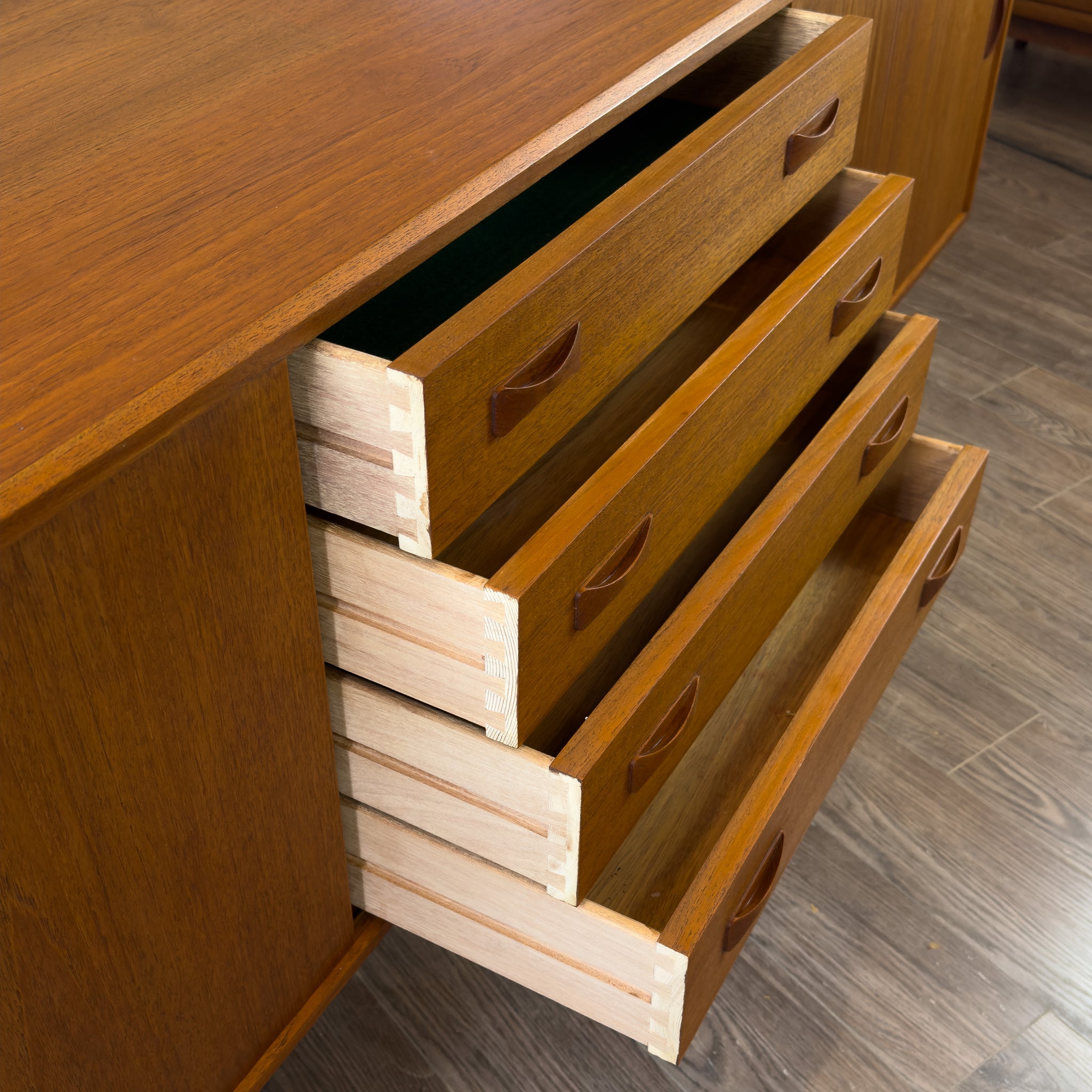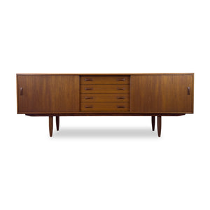 Description: Teak sideboard by Clausen and Son. Four centre drawers and outer sliding doors with adjustable shelving.