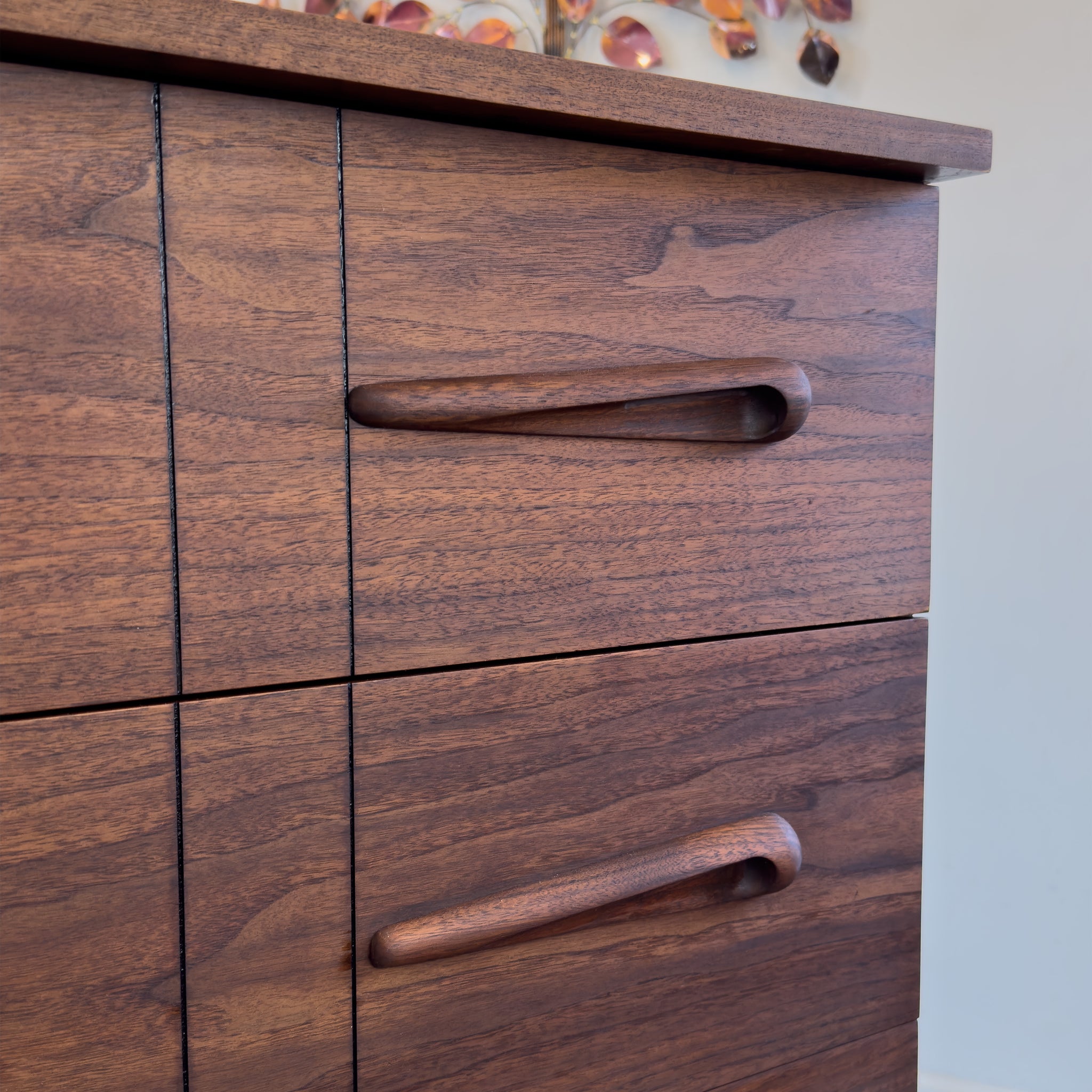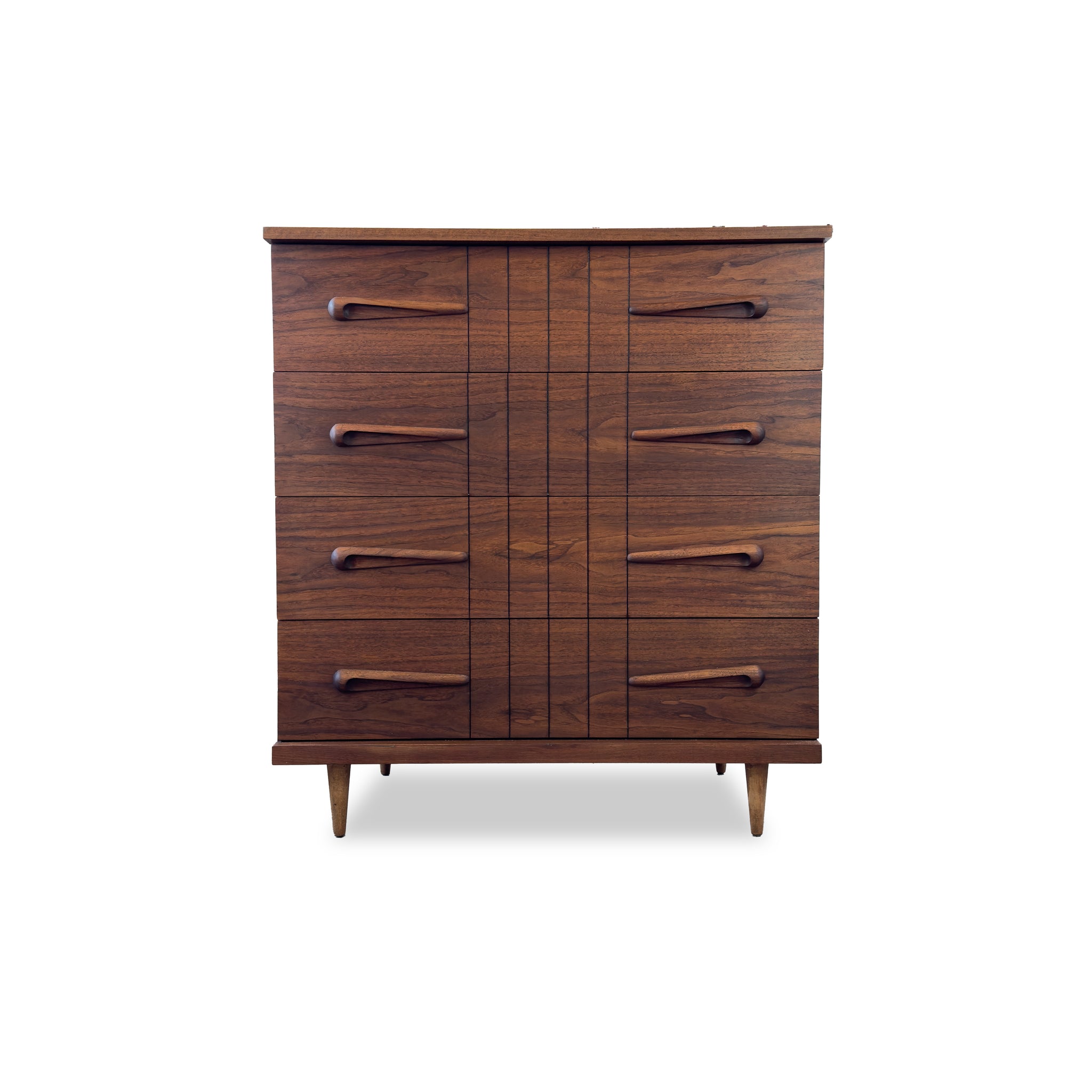 Description: Walnut highboy by Viscol. Four drawers. Sculpted drawer pulls.