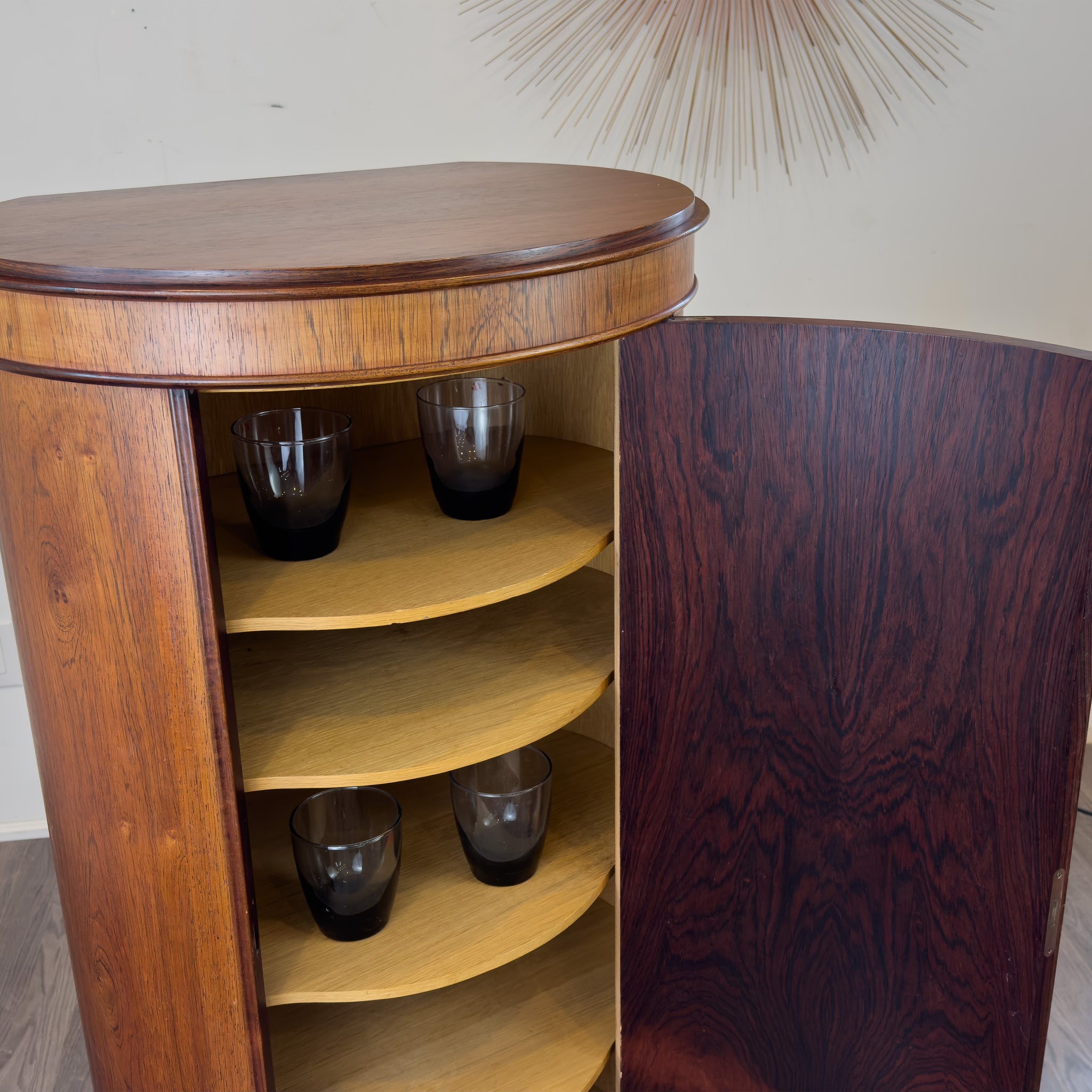 Description: Rosewood bar cabinet with adjustable removable shelving. Designed by Johannes Sorth for Bornholms Møbelfabrik. Model 205.