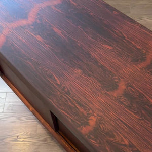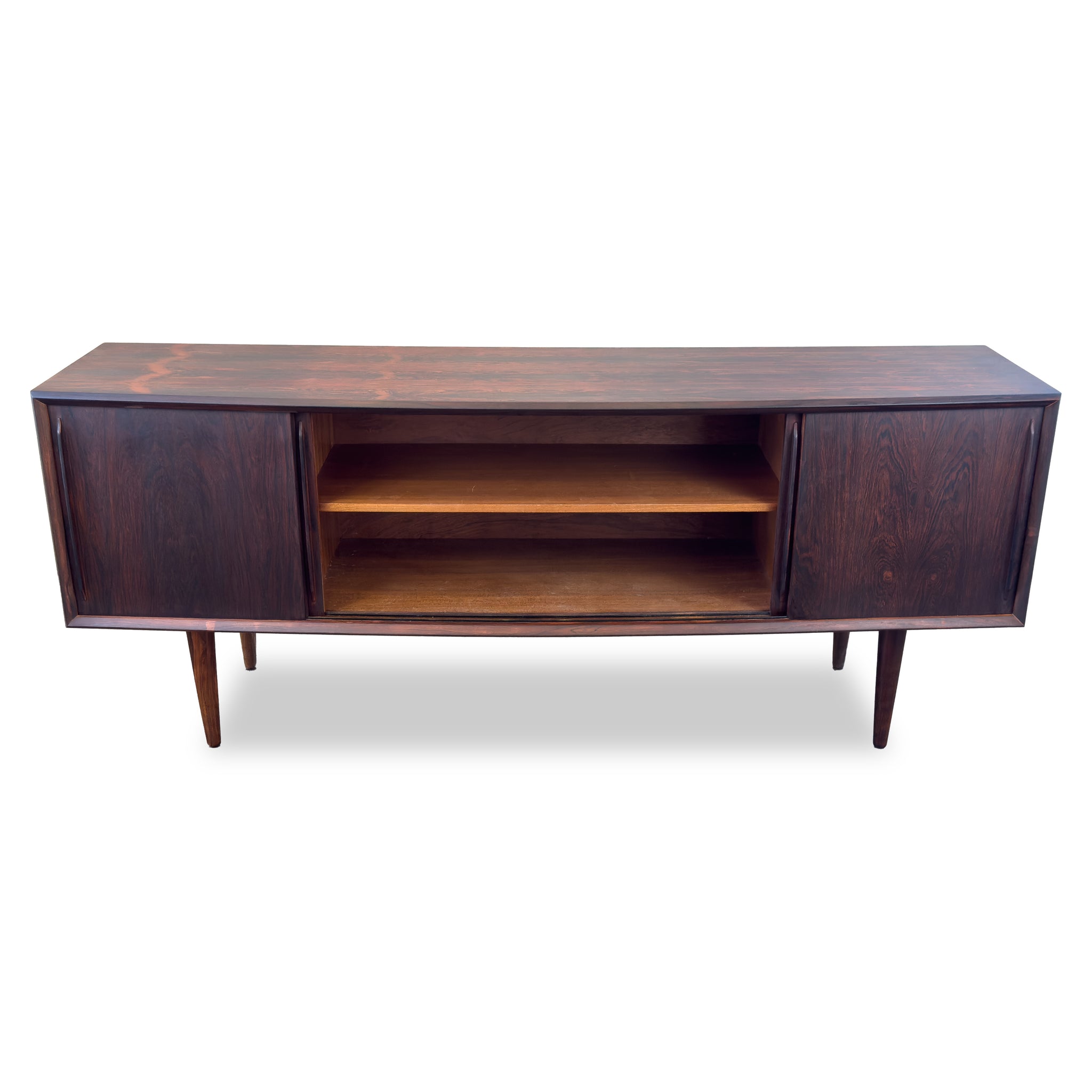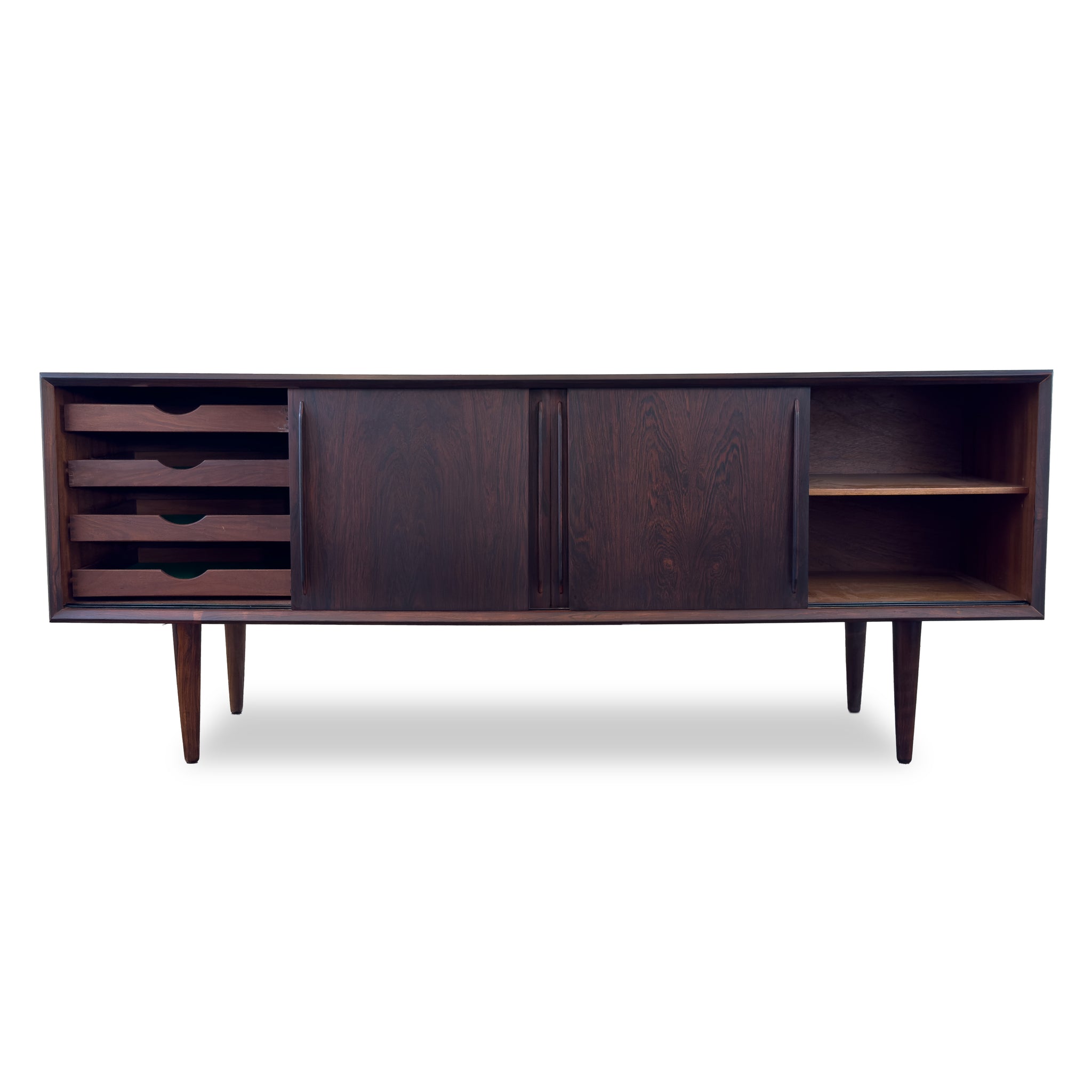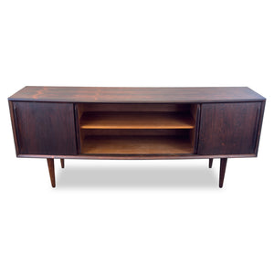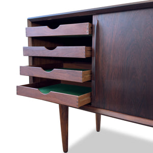 Description:Heirloom sideboard by H.P. Hansen in beautiful Brazilian Rosewood. Four sliding doors reveal adjustable shelving and five drawers.