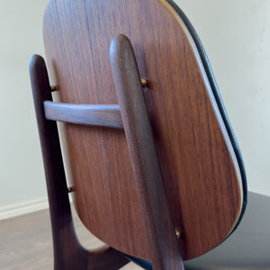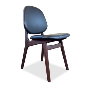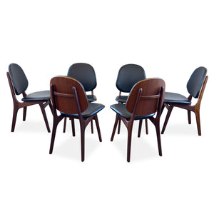 Description:Set of six teak shield back dining chairs designed by Arne Hovmand Olsen. Denmark, C. 1960s. Backrests appear to be floating on the solid African teak frame with small brass dividers. Exceptional profiles. Very comfortable design. Genuine leather.