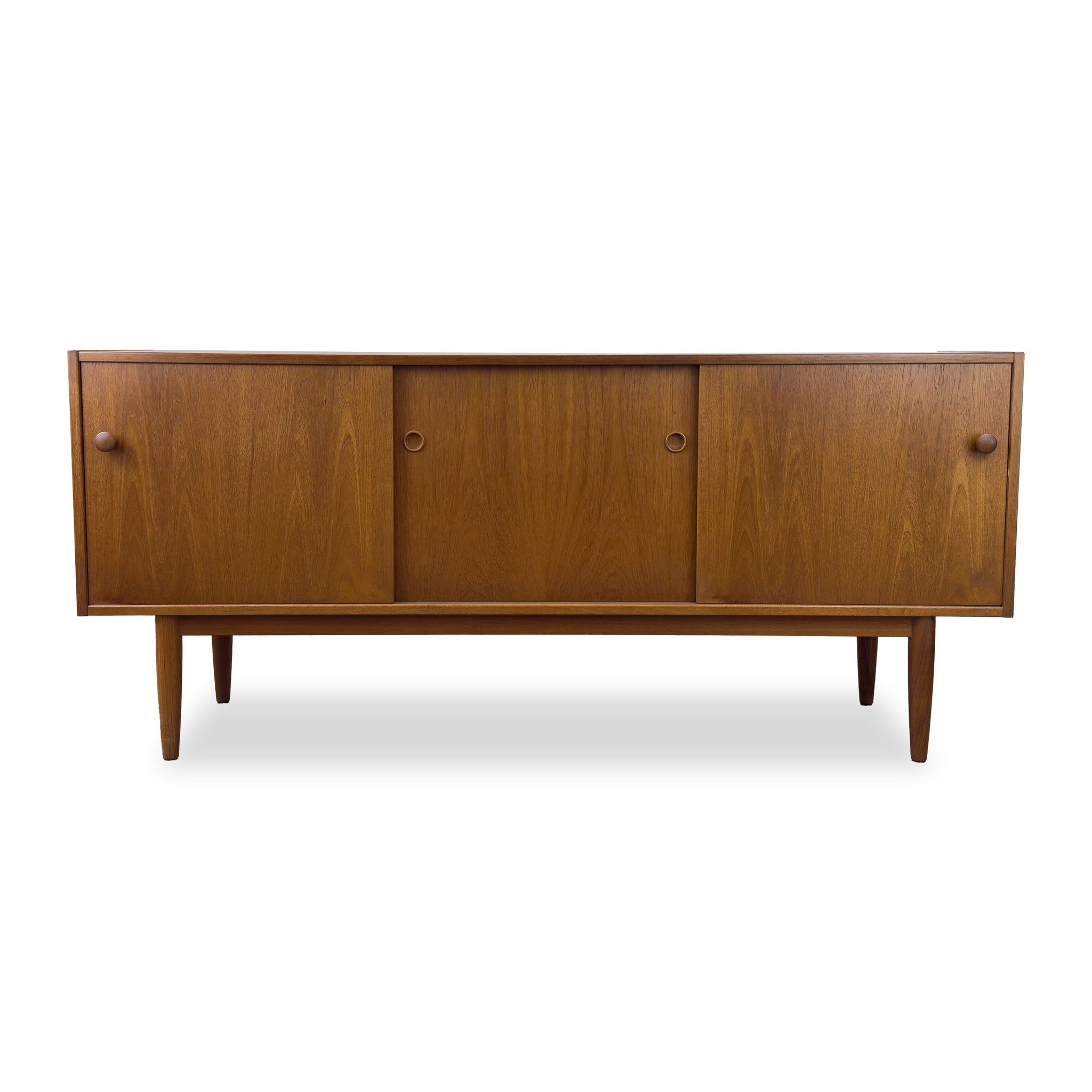 Description: Vintage teak sideboard by Troeds Bjarnum, Sweden. Three sliding doors. Inside the left two thirds of the piece has a long shelf and on the right side of the piece is a bank of two drawers and lower storage space.