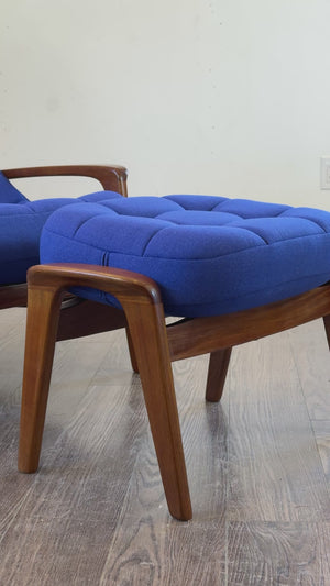 Description: An elusive R. Huber Scoop Chair and ottoman. Amazing "scooped" seat that you just melt into. Beautiful restored solid teak frame and brand new Knoll Textiles "Cobalt Blue" upholstery. New high density foam.