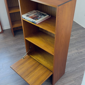 Description: Teak bookcase. Lower drop-down bar. Faux wood back.