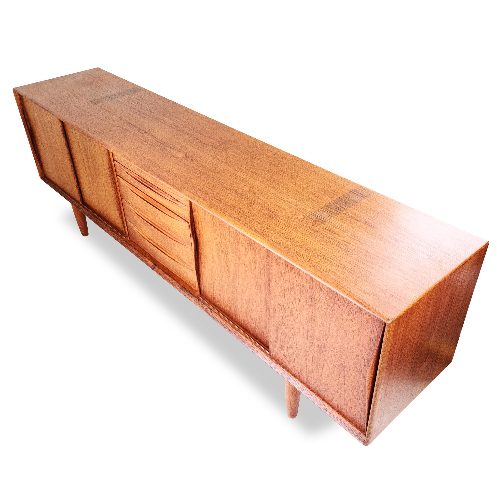 Description: XL teak sideboard by Dyrlund, Denmark. 1960s. Five spacious centre solid teak dovetailed drawers. Four sliding outside doors with incredible sculpted teak pulls. Adjustable shelving behind sliding doors for customized storage. A stunning example of mid century modern design.