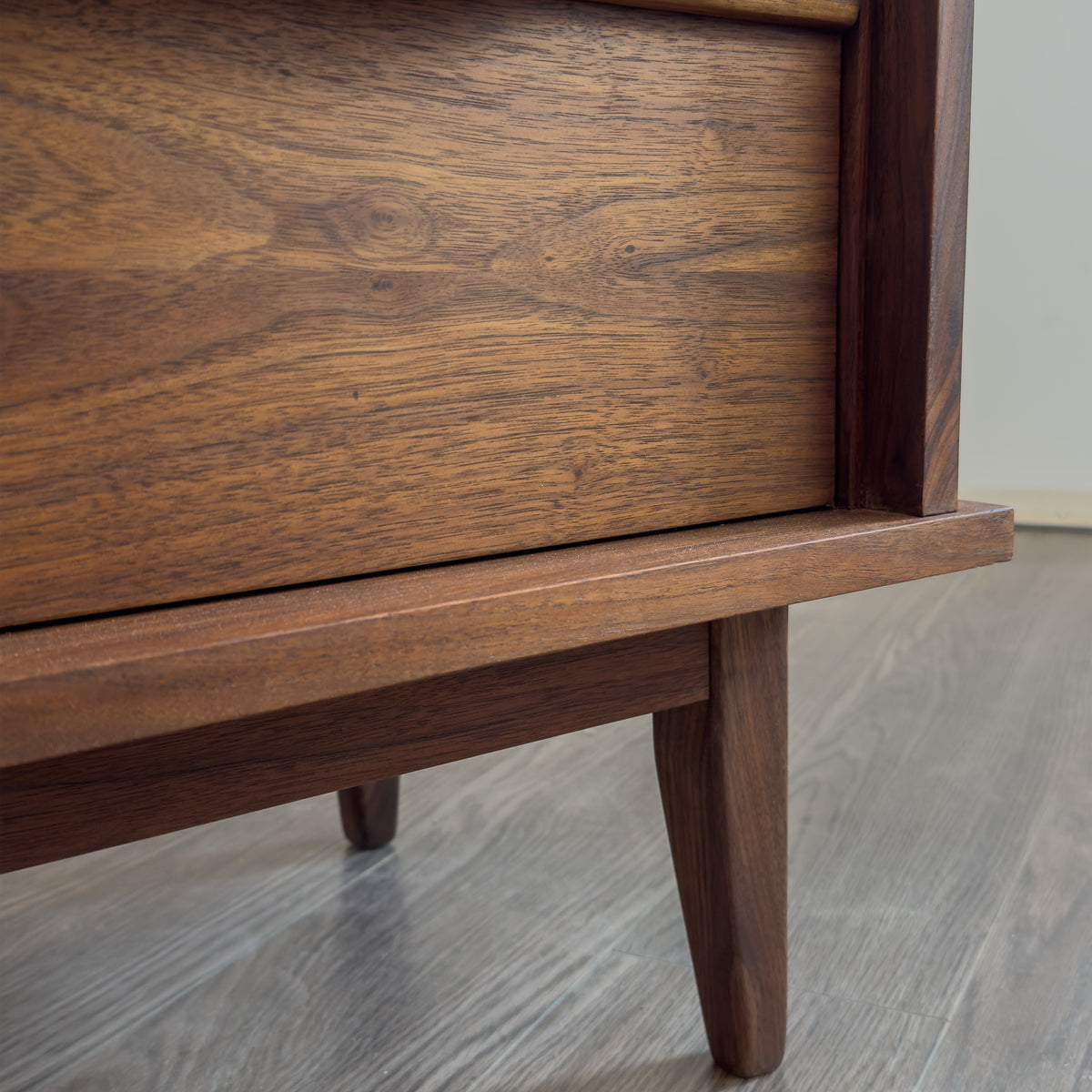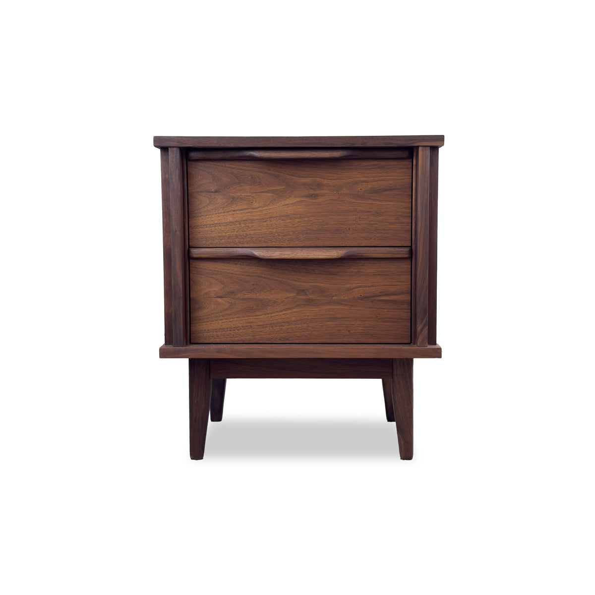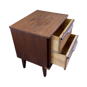 Description: Single walnut bedside table by Princeville. Made in Canada c. 1967. Two drawers, featuring Princeville’s signature sculpted pulls.