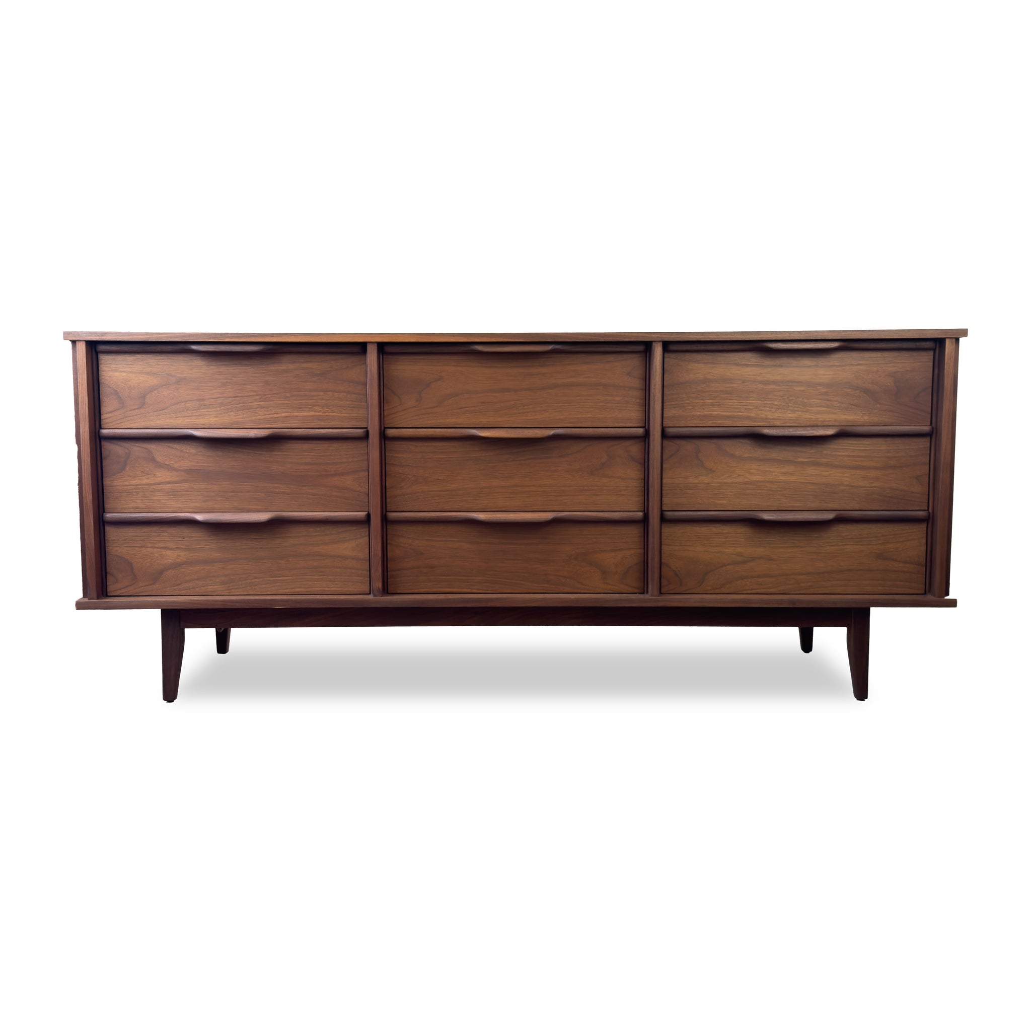 Description: Nine drawer dresser by Princeville. Walnut grain flows from one drawer to the next. Sculpted pulls.