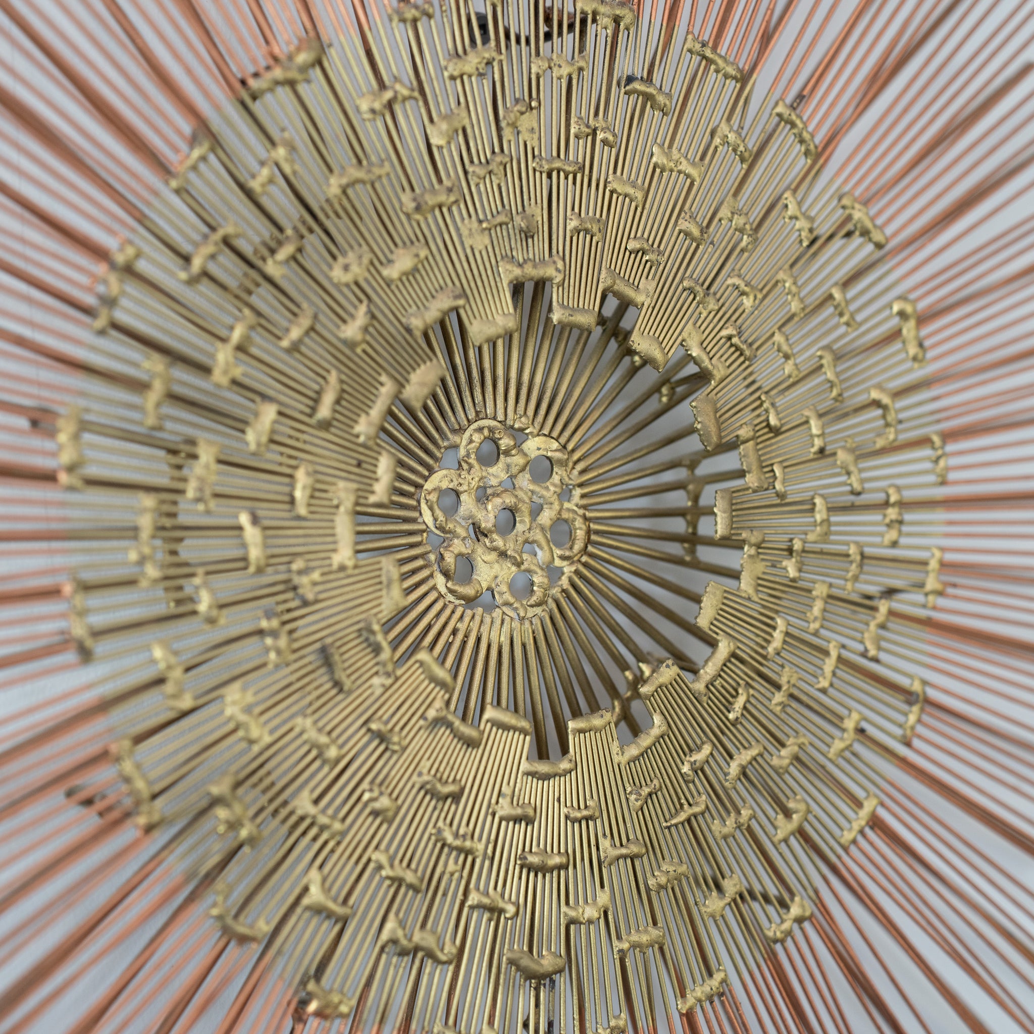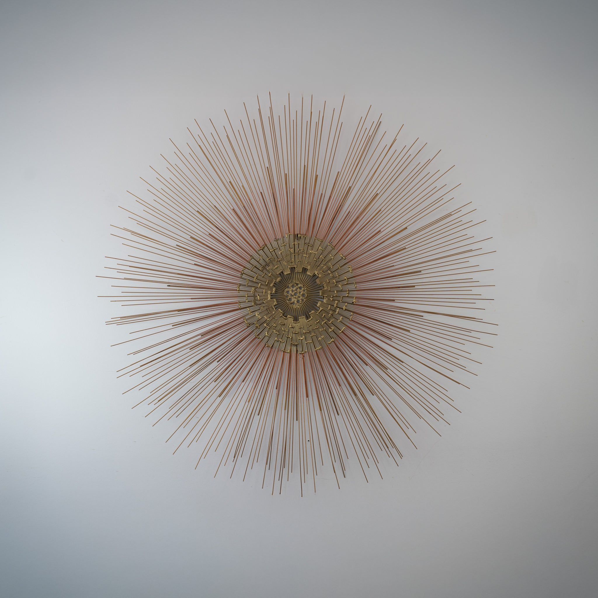 Description: Vintage brass sunburst wall scultpure. Beautiful details.