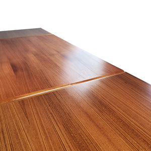 Description: Vintage teak draw leaf table. The leaves tuck effortlessly under the table for easy storage. Opens to extend from a 6 person to a 10 person table.