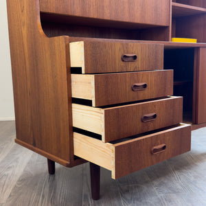 Description: Teak hutch/bookcase with drop down bar. Ample storage with its drawers, sliding doors, and shelving.