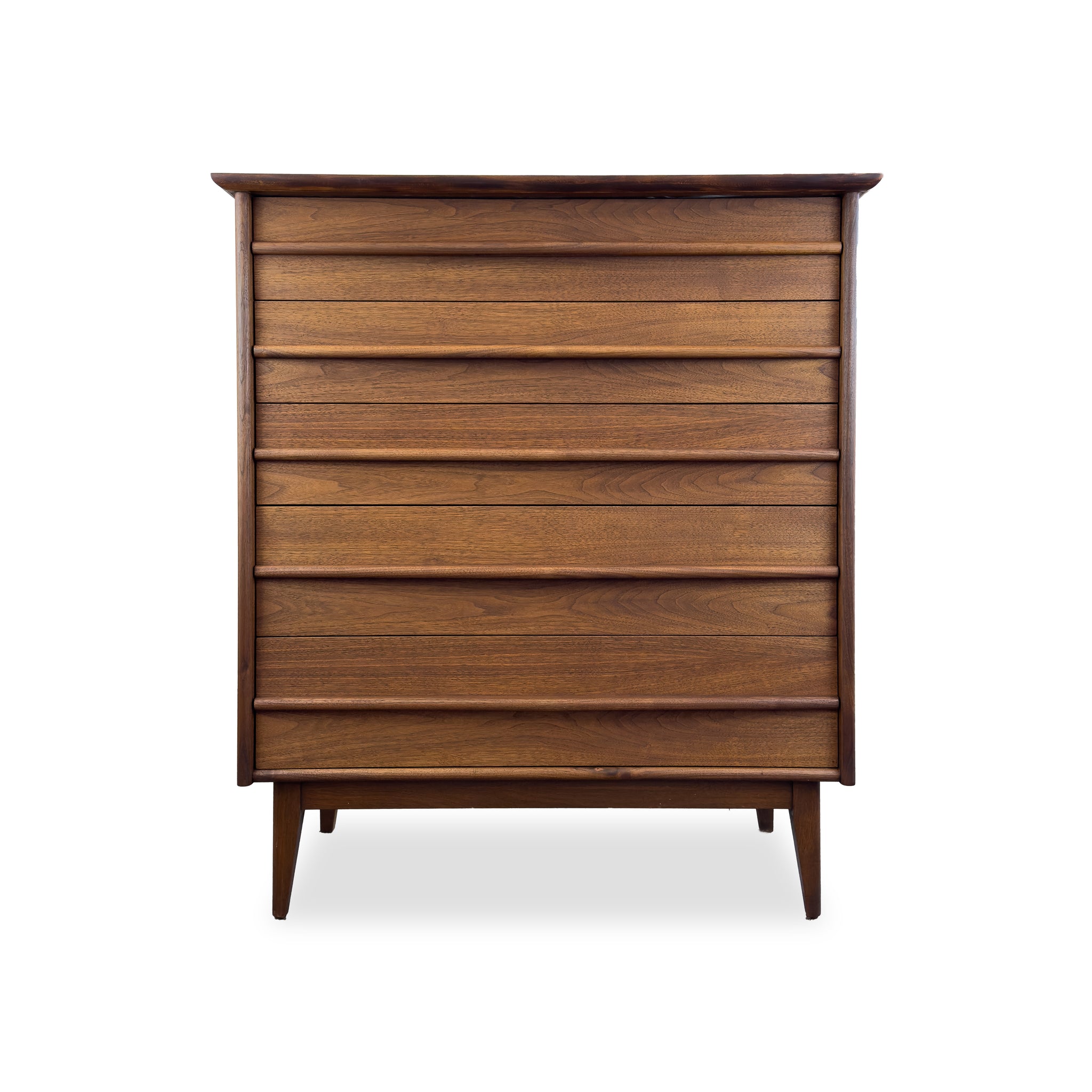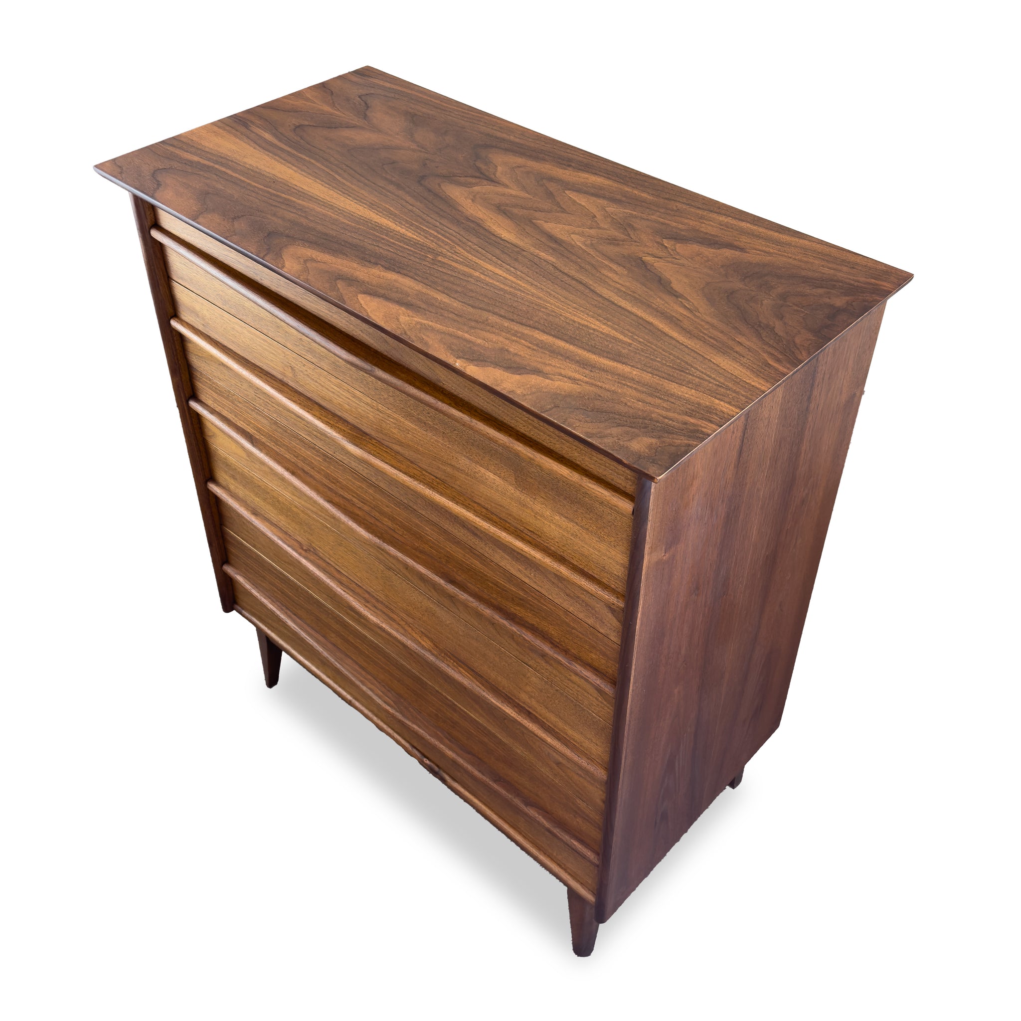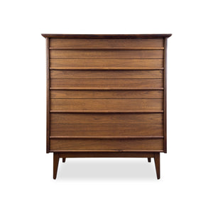 Description: Walnut highboy dresser by Gibbard Furniture of Napanee. Five spacious drawers faced with solid walnut pulls.