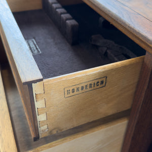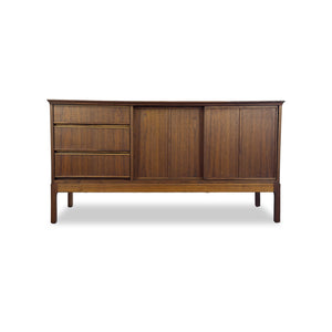 Description: Walnut sideboard by Honderich furniture. Three dovetailed drawers on the left side and sliding doors on the right. Fixed shelving on the interior. Beautiful walnut grain throughout.